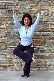 Exhale and bend your left knee as if to sit. Keep hips and shoulders