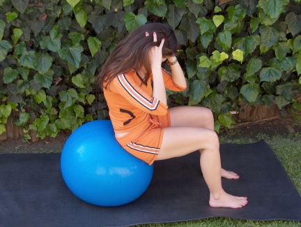 Sit on the ball with your feet hips width apart. Feet can be wider