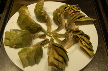 to cool. Quarter the artichokes, scoop out the fuzzy insides